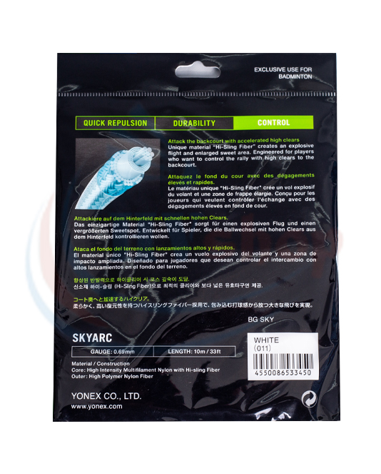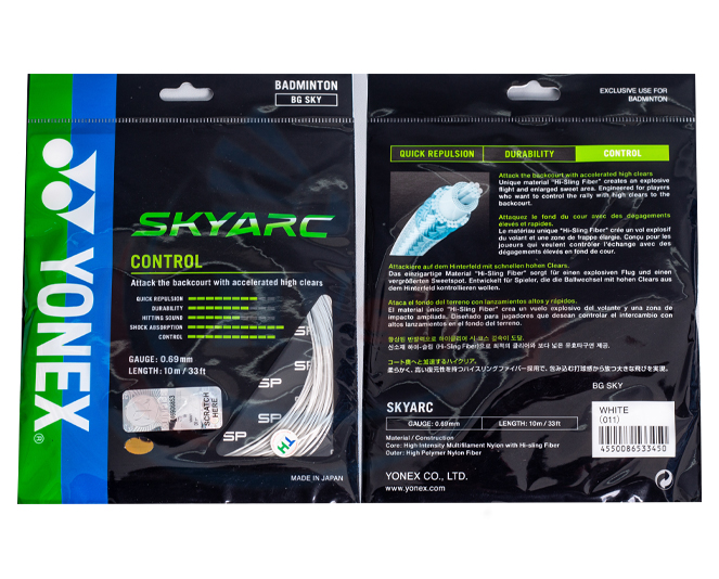 HI-SLING FIBER: Đây là chất liệu đặc biệt của Yonex sử dụng trên các loại cước căng vợt cao cấp. Yonex Skyarc thiết kế cho phép người chơi tăng khả năng kiểm soát đường cầu thêm chính xác, tăng vùng điểm ngọt vợt, tăng sức mạnh trong các pha ép cầu dồn dập, liên tục sang sân đối thủ.