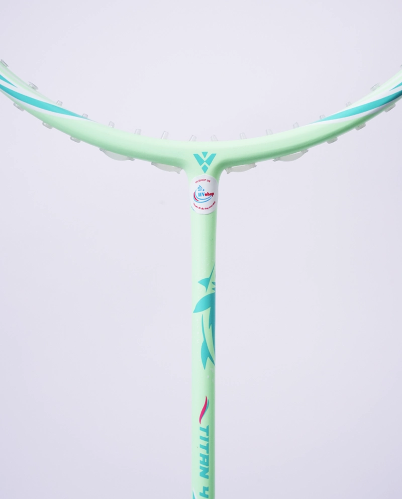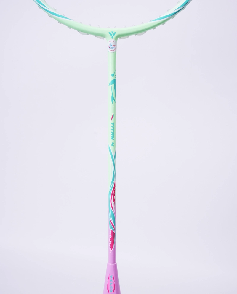 Gây ấn tượng mạnh mẽ ngay từ cái nhìn đầu tiên với phối màu vô cùng ngọt ngào và nữ tính, vợt được phủ trên mình nước sơn xanh ngọc chủ đạo, kết hợp cùng các họa tiết hồng và tím, hình ảnh chú cá mập xuất hiện trên hai bên khung vợt làm điểm nhấn tăng thêm sự độc đáo cho thiết kế Vicleo Titan 4 đầy trẻ trung và năng động.
