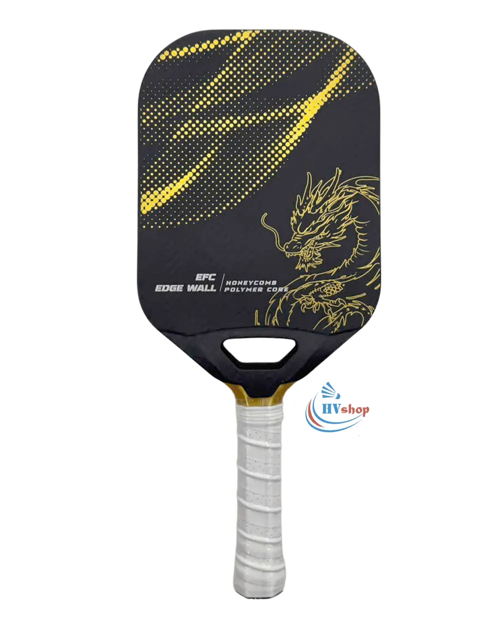 Điểm nhấn quan trọng nhất trong thiết kế chính là hình ảnh rồng vàng được in nổi bật trên bề mặt vợt. Hình tượng rồng – biểu trưng cho sức mạnh, quyền lực và sự may mắn trong văn hóa phương Đông – mang đến cho người chơi không chỉ phong cách mà còn là cảm giác tự tin, mạnh mẽ trong từng cú đánh.